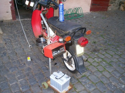Zuerst habe ich mich mal um den Motor gekümmert. Der Seilzugstarter wurde zerlegt und gereinigt, anschließend wieder gefettet und siehe da, er funktioniert wieder. Anschlißend wurde der Vergaser demontiert und gereinigt. Das alte Benzin aus dem Tank wurde abgelassen und auch der Tank wurde von innen gereinigt, da sich hier schon einiges an Dreck abgesetzt hatte. Der Motor wurde demontiert, geprüft und gereinigt, die Zündkerze wurde ersetzt. Nachdem alles wieder zusammengestzt war, folgte der erste Startversuch. Der Motor sprang nach dem 3. ziehen an und lief sofort einwandfrei und ohne störende Nebengeräusche. Also auf zur Probefahrt. Da die Bremsleistung etwas schwach war, wurden die Bremsbeläge vorne und hinten erneuert. Ebenso wurden neue Reifen und Schläuche aufgezogen. Die Bowdenzüge wurden vorsichtshalber auch erneuert. Soweit die Technik, dann kam die Optik an die Reihe, denn was gut läuft, soll auch gut aussehen.